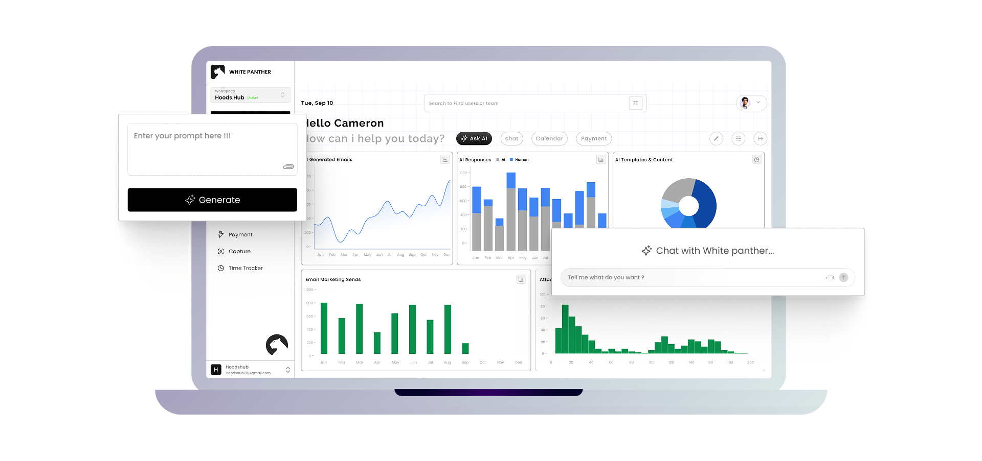 WhitePanther is an all‑in‑one work dashboard that brings email, chat, tasks, meetings, files, time tracking, and AI tools into one place. Everything works together with no reloads and no tab switching.