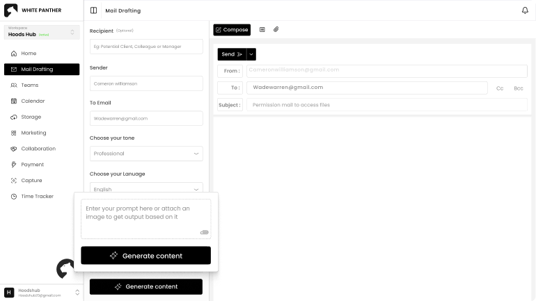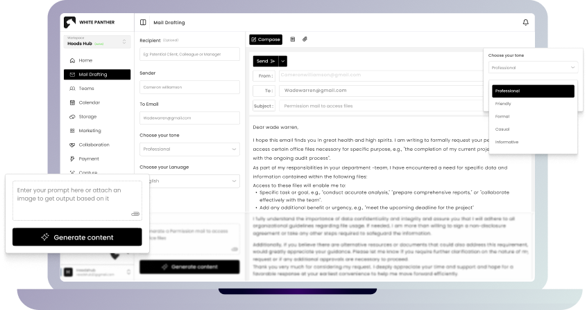 Turn a short prompt into a structured, professional email in seconds. Just describe what you want to say, who it’s for, and how it should sound. WhitePanther generates a ready-to-send draft that feels natural, clear, and complete.