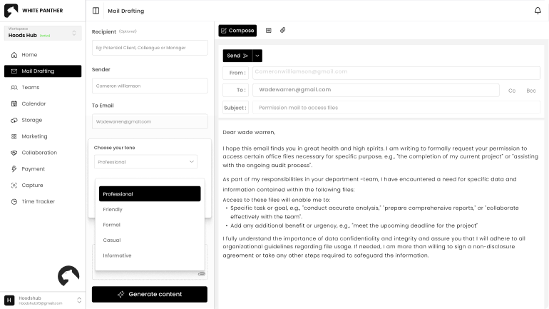 Choose how you want to sound before you hit send. Whether it’s formal, friendly, assertive, or persuasive, WhitePanther adjusts your message to match the situation and the person receiving it.