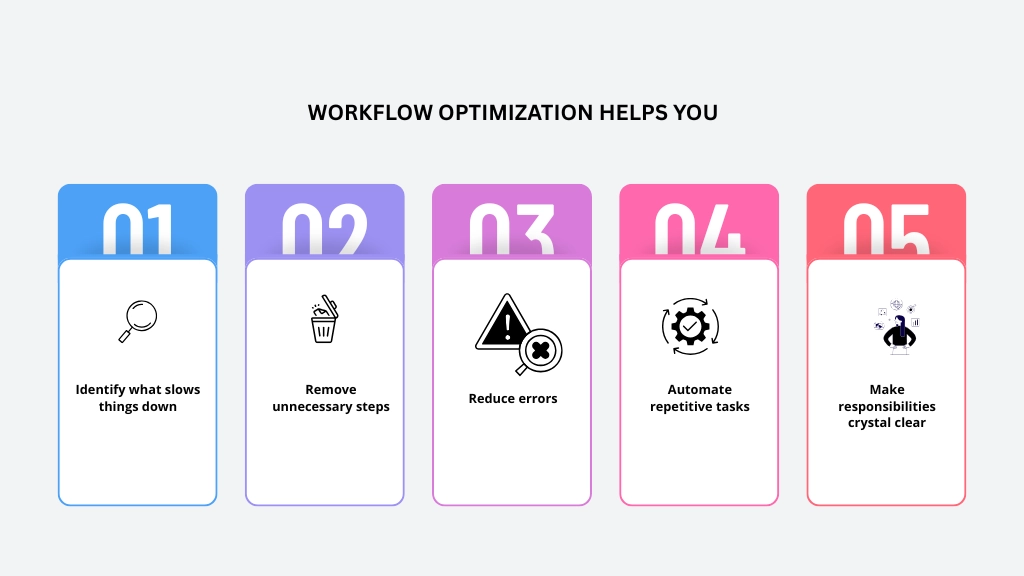 - Workflow optimization improves how work moves across your business.